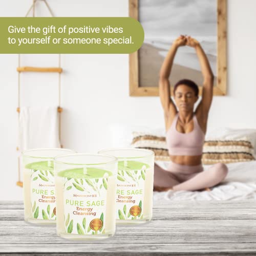 - Aromatherapy and Manifestation Candles: Made of naturally cultivated sage and 100% natural soy wax (no petroleum or paraffin wax), this blend of earthy sage aromas creates a natural harmony in the home and body to help you focus on energy clearing, protection, and blessings. This set includes three 3.5-oz candles in glass candle holders